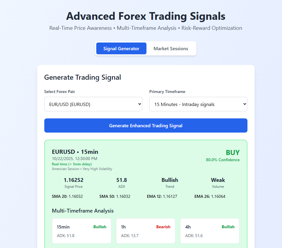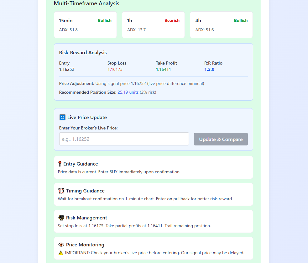 "Live signals on EURUSD - Green = BUY, Red = SELL" "Professional dashboard with real-time analysis" "Multi-timeframe ADX consensus in action" etc.
